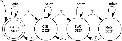 (d.2) This FSA works fine in theory, but for a realistic nesting depth of a few dozen, the diagram would be tediously repetitious. So you decide to simplify things and encapsulate the state information in a simple integer counter. Then you can have a single state on the page, and all the action happens in the transition steps, where you increment the counter for each left parenthesis and decrement it for each right parenthesis. [Having a variable may appear to violate the definition of a finite-state machine, all of whose information is encapsulated in a finite number of states. But since integer variables on computers (as opposed to integers in mathematics) always have a finite upper bound, we're technically safe. If our machine used a stack to keep track of the unbalanced parentheses (which is what our integer counter is modeling), it would no longer be an FSA—it would be a PDA (push-down automaton), which can accept a broader class of languages.]