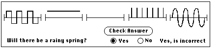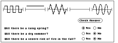 Procedures. Each subject was shown data on the computer from a single year and asked to make a prediction (e.g., whether there would be a severe risk of fire in the fall) by clicking on a circle next to the word Yes or a circle next to the word No (i.e., using a mouse to move a pointer to the circle and pressing a button on the mouse). Next, the subject clicked on a box labeled Check Answer. While still displaying the data, the computer indicated to the subject whether his answer was the correct answer. If the subject's answer was correct, the subject could click on a box labeled Continue and data from another year was shown. Otherwise, he selected a different answer and clicked on Check Answer again. This process was repeated until the subjects performed at a level that ensured they had learned an accurate approximation to the concept (making no more than one error in any sequence of 24 consecutive trials). The subjects were allowed as much time as they wanted to make their prediction and to view the data after the correct answer was shown. This process of learning a concept to criteria was repeated for each of the four concepts learned. We recorded the number of the last trial on which the subject made an error, the total number of errors made by the subject for each concept, and the number of made on each block of 16 trials. If the subject did not obtain the correct answer after 96 trials, we recorded that the last error was made on trial 96.