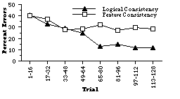 Figure 4 The mean percentage of errors made by subjects in the logical consistency and feature consistency groups as a function of the trial in Experiment 2.