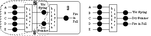 The network diagrammed on the left side of Figure 5 shows a typical way of using networks to learn sub-task concepts with the network applied to Experiment 1. (Please note that in order to make the diagrams more comprehensible, only some of the connections between nodes are drawn. In an actual network, all the nodes of a hidden layer would be connected to all of its input and output nodes.) The network first learns the section enclosed in the solid line. The two inputs are analogous to the abstract features shown our subjects in the first phase of the experiment. The output is the network's guess at whether or not there will be a severe risk of fire in the fall. Second, the network is trained on the section enclosed in the dashed line. This represents learning the Wet Spring concept. The five inputs (A-E) on the left represent the five instrument displays shown to the human subjects. The output is the network's prediction at whether there will be a wet spring. Third, the Dry Summer concept is trained on the network section enclosed in the dotted line. The same five inputs are used as were used to learn the previous concept. The output is the network's guess at whether there will be a dry summer. The wet spring and dry summer concepts are the sub-tasks the network learns. The final Fire in the Fall concept is represented by training and testing on the entire network. The network uses the five inputs to decide if there will be a severe risk of fire in the fall.