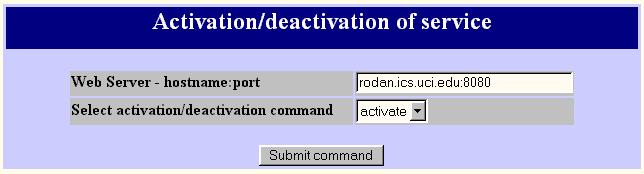 Activation/deactivation of service. This form allows the activation (start) and deactivation (kill) of the remote administration daemon in a given host. The remote server is activated through a CGI script ran through a web browser. If the host does not have a web server, the UnidAdm server.pl script must be started manually or as part of the host initialization scripts.