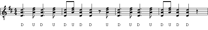 This strum pattern is very similar to Strum Pattern 2. The only difference is that there are two down strokes that are removed.