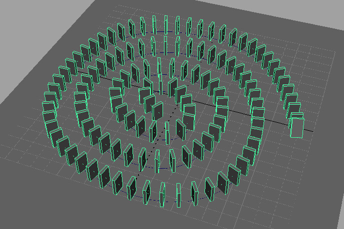 (IMPORTANT: Do not duplicate dominoes that are already rigid bodies, as duplicated rigid body nodes will not work. Set up all of your dominoes first, then make them rigid bodies.)