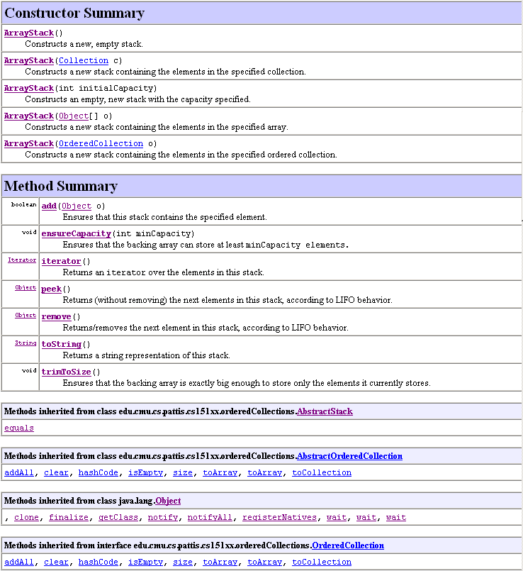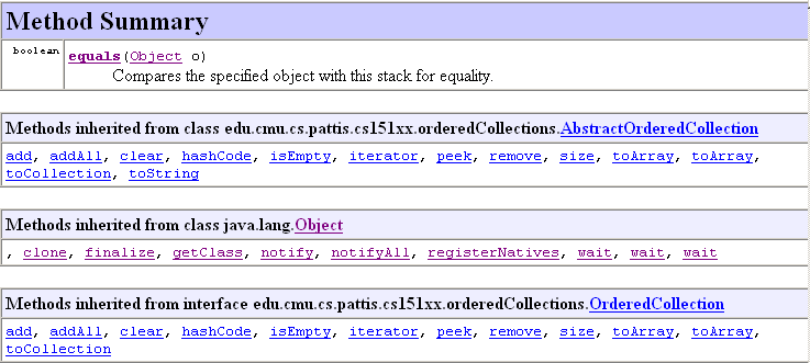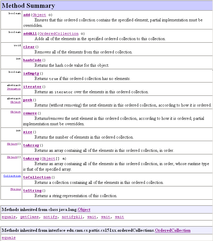 | Interfaces | The methods specified in the OrderedCollection interface are summarized in the following Javadoc (you can read the full Javadoc online, using the Javadoc of Course API link). The semantics of most methods should be somewhat intuitive. Primarily, objects can be added and removed from an ordered collection: their order of removal is based on the type of ordered collection: LIFO (for stacks), FIFO (for queues), and "priority ordering" for priority queues. |