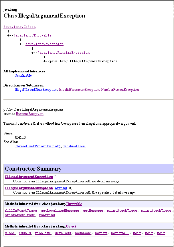 Below is a much longer -but still not complete- list of the the first four levels in this hierarchy; indentation indicates the subclass relationship: e.g., the Error class is a subclass of Throwable (and the Throwable class itself is a subclass of Object). For an objects to be throwable (e.g., throw new ...), it must be constructed from some class in the Throwable hierarchy (either Throwable or one of its subclasses). The Throwable class itself declares two constructors (one with a message String, one without), and a few interesting methods (getMessage and various overloaded versions of printStackTrace) that are inherited in sublcasses and often called when exceptions are caught). The top three classes in this hierarchy (the Throwable, Error, and Exception classes) are all defined in the java.lang package (which is automatically imported into every class file). Many other exceptions are also defined in this package, while others are defined elsewhere (e.g., IOException is defined in the java.iopackage; EmptyStackException is defined in the java.util) package. Many of the exceptions that we have seen are under the hierarchy: Throwable, Exception, RuntimeException. I compiled the following list by visiting the JavaDoc pages in Sun's API and doing lots of copying and pasting. As you can imagine by the length of this list of built-in classes, exceptions are central to the Java language. Understanding how to throw and catch exceptions is intergral to understanding Java and and how to program in it. Note that the prime reason that so many different exception classes exist is their different names. The names are used in try/catch statements to decide selectively which exceptions to catch, and how to process these exceptions differently. When we define new classes whose methods throw exceptions, we can throw any of the exception classes already written, or we might want to define new exception classes, and by throwing them signal some special failure in the ability of methods to perform their required actions. Throwable