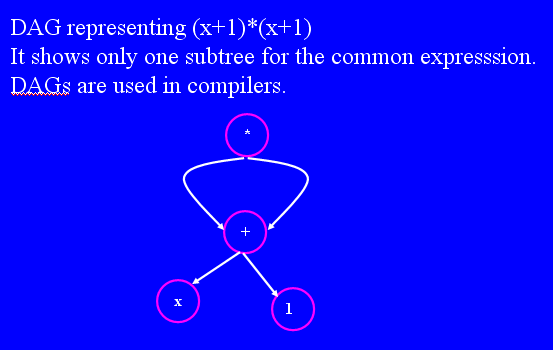 In fact, we can define a linear linked list as a restricted graph: all nodes have an in-degree and out-degree of 1 (except the first has an in-degree 0 and the last has out-degree of 0); trees can be similarly defined in terms of a restricted graph: an acyclic graph in which every modes has in-degree of 1 (except the first which has an in-degree of 0). Both cycles and in-dgree are technical terms defined below). Here is a picture of a DAG (directed acyclic graph) which is halfway between a tree (it has no cycles) and a graph (but it has a node with in-degree two: the common subexpression). |