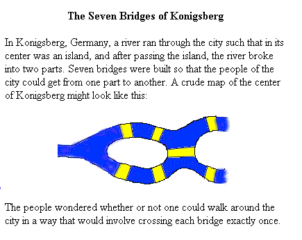 A similar but much more extensive graph is used as the underlying data structure in Mapquest, a web site that plans travel routes, including computing the amount of travel time. Note that real graphs might model one-way streets (so there may be an edge -a street that one can travel- from corner1 to corner2 but not vice versa). Also, some roads may be partitioned into more lanes going one way than the other, so although there are edges going each way, their values might be different. In the future, programs such a Mapquest might take into account what time you are traveling (in some places, traffic patterns vary tremendously from the norm during rush hours); in fact, if billions of sensors are placed on roads throughout the US, they could report traffic slowdowns to Mapquest, which could contact you in your car (via something like the Onstar system) and automatically reroute you to avoid such delays. Graphs can also easily model the servers (nodes) and transmission lines (edges, with their transmission speeds/capacities -bandwidth- indicated by their values) of the internet. We can ask questions like what is the minimum time it would take to transmit a large number of web pages from one server to another using all the paths available, not exceeding the bandwidth of any transmission line. This problem, a bit beyond the scope of this course, was originally solved by the Ford-Fulkerson algorithm, and improved by the Edmonds-Karp algorithm, whose complexity class is O(nm2), where n is the number of nodes and m is the number of edges respectively in the graph. |