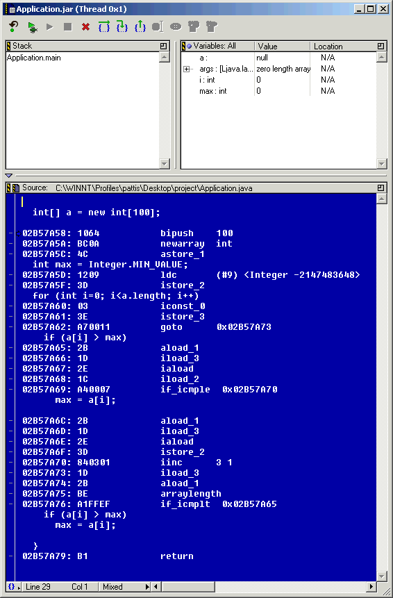 We can easily examine the machine language instructions that Java produces for this code by using the debugger. If we specify Mixed on the bottom control of its window, Java shows us the Java code interspersed with the machine language instructions.