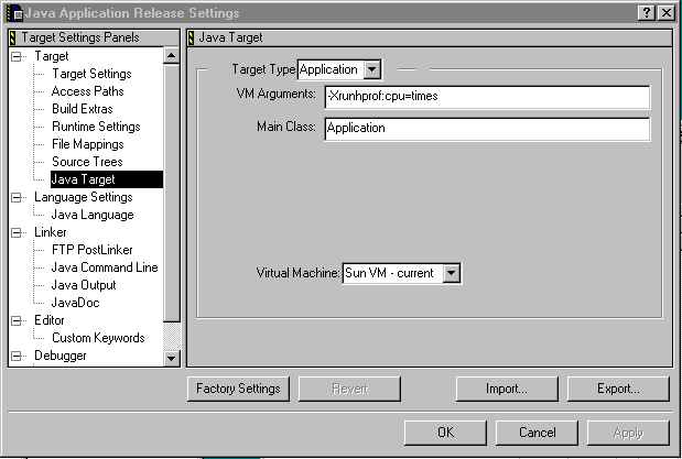 Java has a very simple (but not so useful) built-in profiler. To use it, select Edit from the Metrowerks CodeWarrior toolbar, then select Java Application Release Setting. In the Target Settings Panel, click on Java Target and in the VM Arguments text field, enter -Xrunhprof:cpu=times as is illustrated below. |