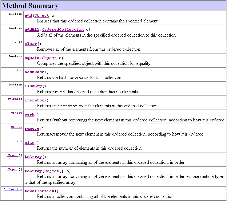 | Interfaces | The methods specified in the OrderedCollection interface are summarized in the following Javadoc (you can read the full Javadoc online, using the Javadoc of Course API link). The semantics of most methods should be somewhat intuitive. Primarily, objects can be added and removed from an ordered collection: their order of removal is based on the type of ordered collection: LIFO (for stacks), FIFO (for queues), and "priority ordering" for priority queues. |