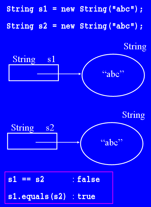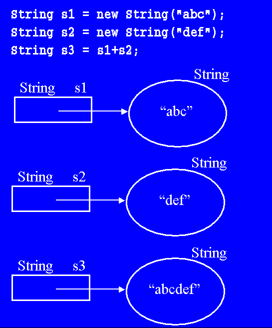 Thus, new String("...") is an expression that has a value: it tells Java to apply the new operator to the String class. The result returned (all operators return results) is a reference to a newly constructed object from the String class. The object itself, represented by a labelled oval) stores the sequence of characters; we can then store the reference to that object inside a variable that is declared to be of type String. References always appear as ARROWS: their tail is INSIDE the variable's box and their head POINTS TO an object (its arrow head touches the oval). In summary the new operator has two aspects to its behavior.