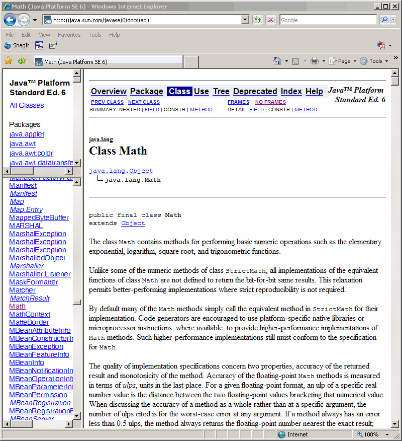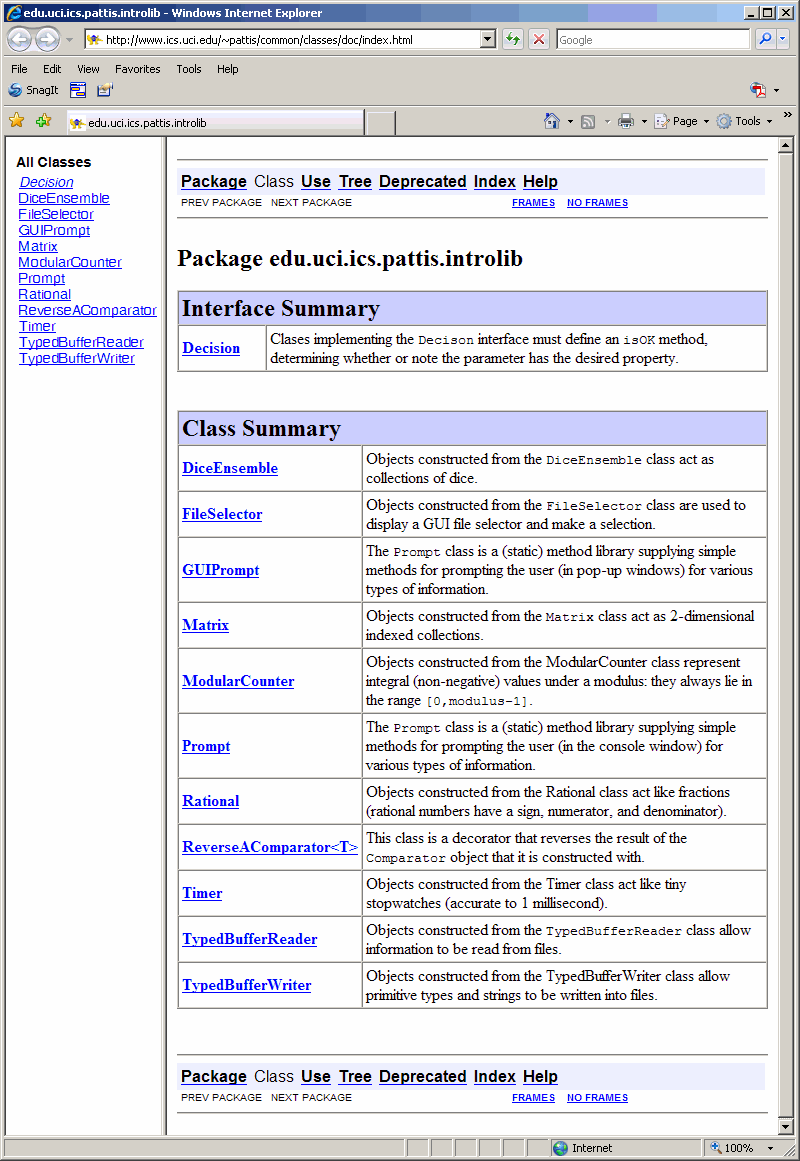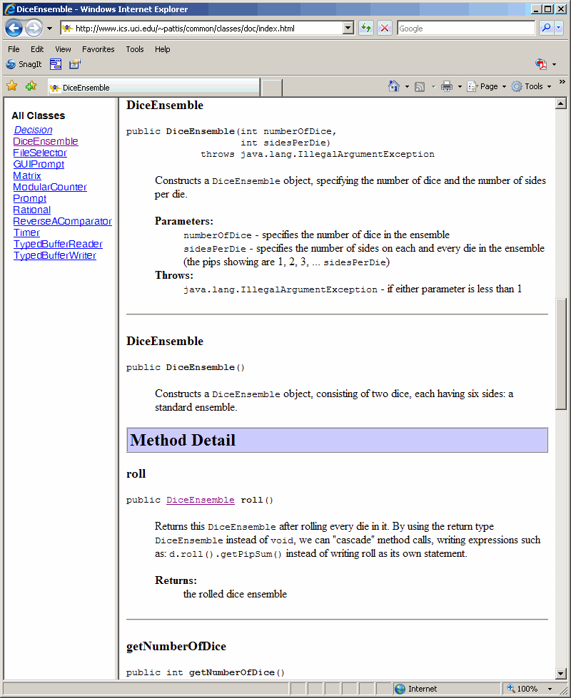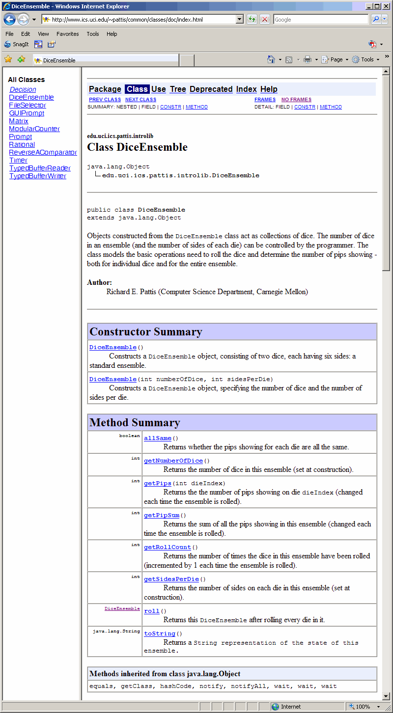 Next we will learn how to recognize and use the three fundamental features of classes (constructors, methods, and fields) to construct and manipulate a wide variety of objects. We will also learn how to read the Javadoc (documentation) for classes, which includes detailed and cross-indexed information about the use and meaning of each feature available in a class. We will examine a sampling of classes from Sun's standard Java library and from ICS-21/22/23's Java library, learning how to manipulate objects constructed from these classes in interesting ways. Finally, we will examine two more classes, which perform file input/output, in detail: TypedBufferReader and TypedBufferWriter. We will reinforce the material covered earlier and learn useful patterns for file input and output using these classes, including more about exception handling, which was briefly discussed in the previous lecture. Each object is a small tool that we can use/manipulate to help us perform some part of a programming task. There are libraries of classes from which we can construct all the tools that we need to make it easier for us to solve programming problems. We will also learn how to build our own tools by learning how to write our own classes. |