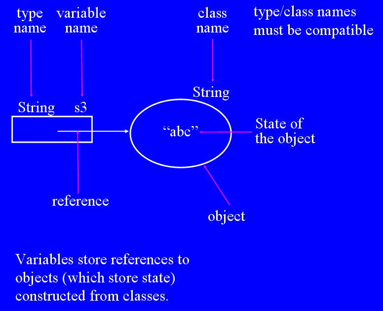 We say that the String variable s3 stores a reference to a String object (the object is constructed by new, which returns a reference to the object it constructed) whose state is initialized to "abc"; Say this sentence out loud a few times; get a feeling for these words, which we will use over and over again, always in the same technical sense. Finally, we frequently talk about the state of an object (what information it stores); we will soon learn about methods that can examine and change the state of an object. |