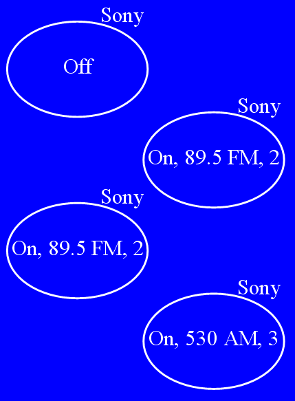 A reference type is most simply the name of a class; these names are just Java identifiers, which by convention start with a capital letter. In fact, we have already learned a bit about one reference type: the String class. Before exploring this class in more detail, let's discuss the fundamental relationship between classes and objects. Read and reread the following paragraphs until they make good sense; think of other examples, discuss this material with friends, and talk to the staff about it. Generally, a class is like a blueprint. We can construct new objects from a class by using Java's new operator, which acts like a skilled worker who can read any blueprint and construct objects from them. Each object stores its own special state (information about that object), which may be the same or different than other objects constructed from the same class. In Java, new is a unary prefix operator, which takes as an operand the name of any class (following the class name, inside parentheses, is any information that the class requires to specify the initial state of the object being constructed). We illustrate objects by ovals; each is labelled by its class name and each encloses its current state. Methods can examine and change the state of an object. For example, we might have the blueprints (class) for constructing a certain model of a Sony radio. We can construct as many radios (objects) as we want from the same blueprint (class). The state of one radio (object) might be turned off; the state of two others might be turned on, playing 89.5 FM at volume level 2; the state of yet another might be playing 503 AM at volume level 3. The four objects just described might be pictured informally as follows. |