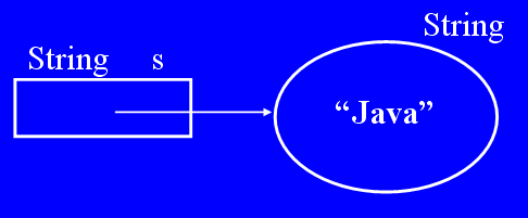 Note: objects have classes but DO NOT have names. Reference variables, which have names and types, store references that refer to objects. The type of a reference variable must always be compatible with the class of the object to which it refers. For simple object-oriented programming, the type will be the same as the class. But, once we begin examining interfaces and and class hierarchies, the relationship between variable types and object classes will become richer and more powerful, but more complicated too. For now, we will keep things simple: the type of a variable will always be the same as the class of the object that it refers to. Putting all these ideas together, we can illustrate the declaration String s = new String("Java"); by |