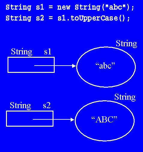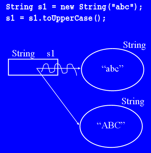 Here, when the toUpperCase method returns its result (a reference to a new object), it is stored back into variable s1. Because a variable may store only one reference at a time, we cross out the other (previously stored) reference. What happens to the original object when, as is the case here, there are no references to it? Java can reclaim it (the storage it occupies) for use later: when new has to construct another object. This concept is called automatic garbage collection and we will continue to discuss it in increasing depth throughout the ICS-21//22/23 sequence. Conceptually, this declaration and assignment is similar to int i = 5; i = -i;, because the variable first stores 5 and then the value of the int variable is used to compute another value (-5) which is stored back into the variable. Whether a variable stores a primitive value or reference, it can store only one values at a time; storing a new value in a variable means replacing (and totally forgetting about) the old value.