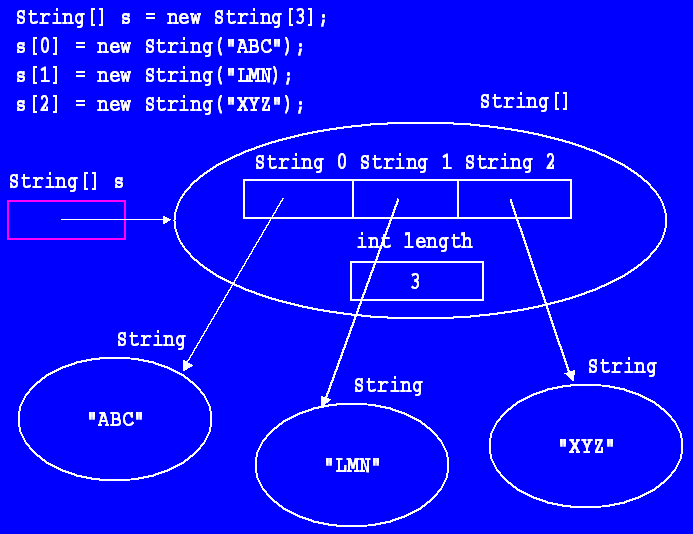 Note that because of the golden rule, we can use s[0] just like any variable of type String; therefore, we can write the expression s[0].length() which returns 3 (the length of the String object referred to in index 0 in the String array s). So generally, when arrays store references to objects in their indexed members, we can call an appropriate method (based on the type of the reference) on any member in the array. Here we can call any String method on any object stored in this array. |