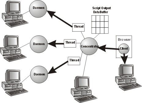 The Network monitoring tool is composed by a set of daemons (operating system level processes) that collect management information from the hosts in a distributed system, and a concentrator server, that periodically collect this information in the monitored servers. In order to be monitored, each host (server) of the system executes a data collection daemon. Some examples of this information collected include: CPU usage, users logged in the machine, free memory, network connection status and so on.