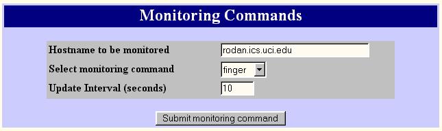 Monitoring Commands. This option displays the output of the UNIX shell commands in a HTML friendly format. Select the host to be monitored, the command to be executed, and the update interval after which the command will be repeated. The monitor is started when the " Submit monitoring command" button is pressed.