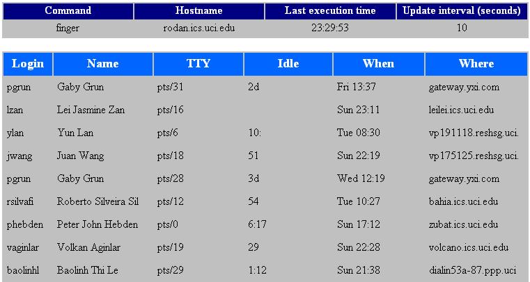 Figure 4 presents the output of the command described in the screenshot of Figure 2. The finger command is executed in the host rodan.ics.uci.edu by the server.pl script using the finger.pl wrapper script. The output of the script is sent by the server.pl to the collectInfo.pl script, which frames this information in a HTML page and presents to the user.