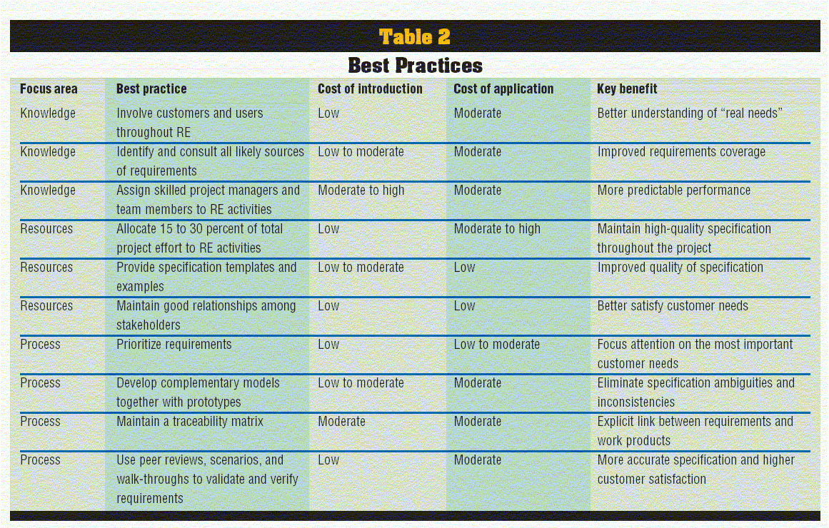 Practices for requirements engineering -- as of July 2001 (graphic)