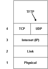 There is a file transfer service in the TCP/IP suite that operates on top of UDP. It is the Trivial File Transfer Protocol, TFTP (see Figure 4). TFTP was designed to be a very simple alternative to FTP, and was conceived to be so simple it could be implemented in a ROM. One big usage originally envisioned was for machine boot of software at startup.
