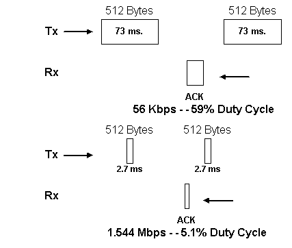 Efficiency of TFTP is also poor in wireline wide area networks, especially at high speeds where the round trip delay of the network represents a large amount of data. With round trip delays of 50 msec. (not unusual in WANs), the effective throughput is only about 5% of port speed at T1 rates as illustrated in Figure 5.