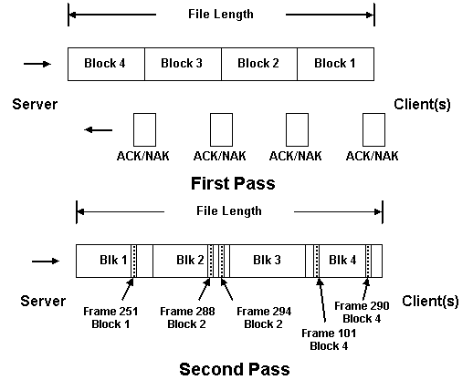 Unlike conventional protocols, the StarBurst MFTP transmitter does not stop and wait for acknowledgments before continuing transmission. Rather, it transmits continuously until the whole file has been transmitted, at which point it sends another "pass" consisting of only those frames that were negatively acknowledged. A third or fourth pass may be required to complete error free transmission to all clients. This is illustrated in Figure 6.