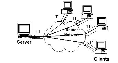 Figure 7 and Figure 8 show T1 connections to both the clients and the server. In Figure 7, multiple FTP sessions are sent over a router network to the clients. The T1 link at the server site must be shared with the four clients, since the four individual FTP sessions are originated at the server.