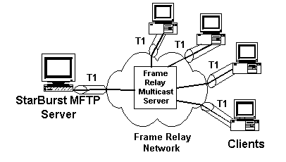 Figure 8 shows a multicast frame relay network using a One-Way Multicast frame relay setup. Not shown are the individual frame relay DLCls (addresses) that connect the StarBurst server to each individual client, which allows point to point traffic as well as multicast traffic.
