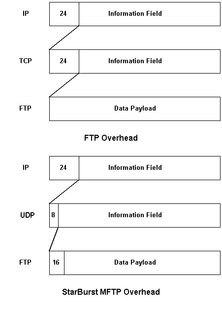 The protocol overhead for FTP and StarBurst MFTP is the same in both cases, as the TCP header is 16 bytes larger than the UDP header, and the StarBurst MFTP header is 16 bytes. This is illustrated in Figure 9.