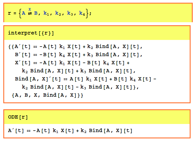ODE[{reaction1,reaction2,...}] returns the list of differential equations found by interpret in a list of reactions.