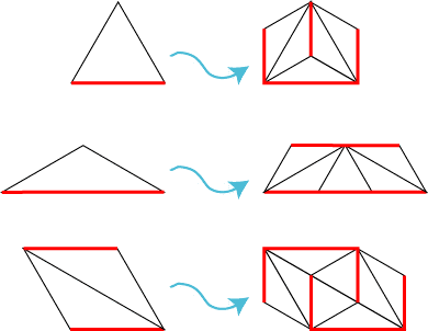 Otherwise, at some level j of the subdivision process, the path we are looking for connecting the two points consists simply of these one or two triangles from the position codes of the two points. We now show that each level of the subdivision process preserves the existence of these paths. To do this, we use a slightly modified version of the subdivision process that ends up tiling a larger area than the original triangles. At each step, we follow the usual subdivisions described above, except that if the resulting area has an isosceles triangle hypotenuse on its boundary that is neither vertical nor horizontal, we add the matching triangle on the other side of that edge. Because of this addition, all isosceles triangles with slanted hypotenuses can be assumed to form matched pairs.