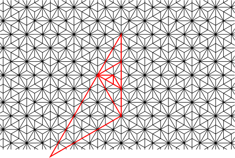 These edges seem to mark out the boundaries of a space-filling labyrinth that covers the entire plane. (The labyrinths of the ancients, unlike modern mazes, were typically unicursal, having neither branches nor dead ends [Phillips].) Because of the tiling's six-fold symmetry, this labyrinth is overlaid with two others, at 30 and 60 degree angles to it.