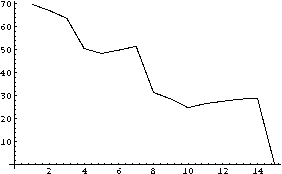 Our code normalizes the vertical axis to match our heuristic prediction of the number of steps remaining. At least for this example, the numerators seem to decrease much more quickly than our prediction, so the number of terms generated (15) is considerably smaller than the 70 we would expect. It is also interesting to note the large drops made by the numerator in the third, seventh, and final steps. A closer inspection reveals that these phenomena are due to cancellation between common factors of the numerators and denominators of intermediate terms: these three steps involve common factors of 63, 45, and 5739, and two other steps involve factors of three. It is not clear to me why such large cancellations should occur.