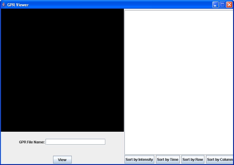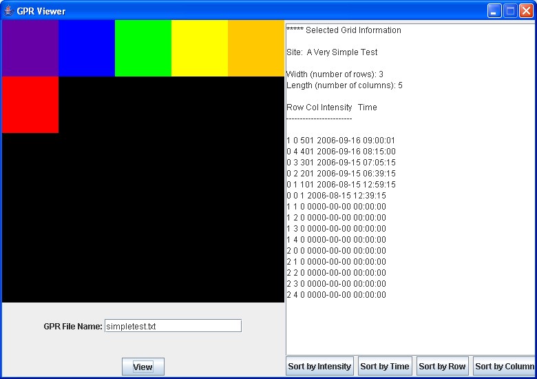 The user enters the name of a file in the GPR File Name: text box and presses the View button. If the file does not exist, an error message prints and the screen is otherwise left unchanged. If the file does exist, a color-coded map of the surveyed area appears in the map area above the file name and a text report containing survey information appears in the right-side window.