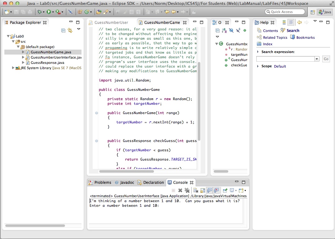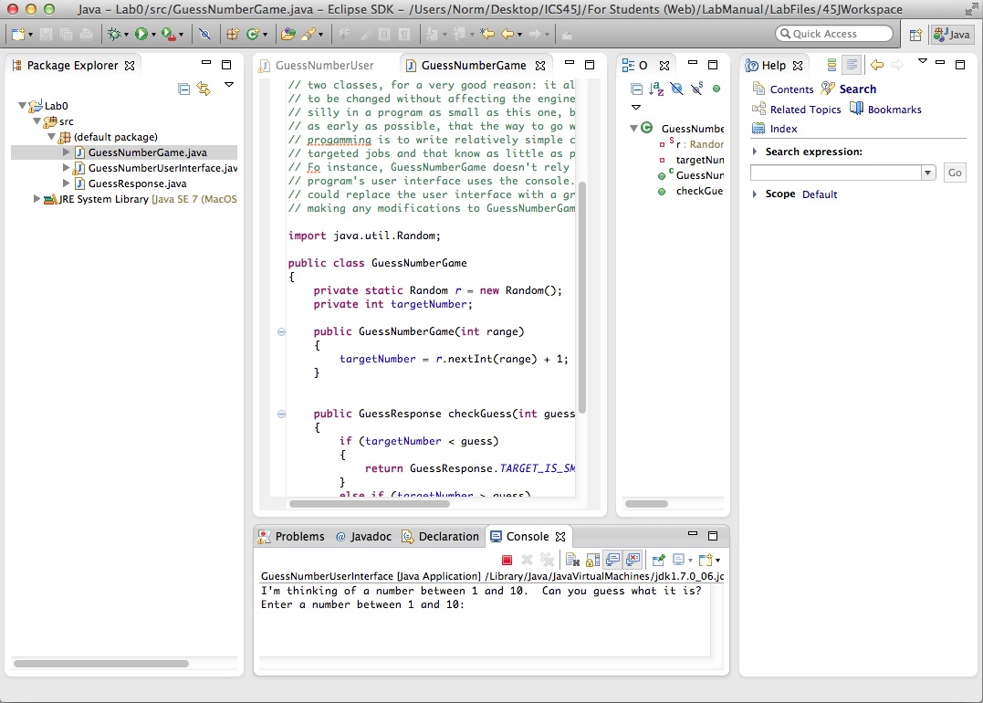 The following is a screenshot of Eclipse in action. (Your screen's appearance may differ in minor ways from the one shown here, depending upon the version of Eclipse you are using and whether you're on a Mac or PC,but the features' behavior is the same.)