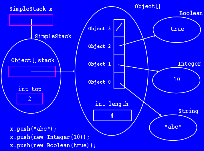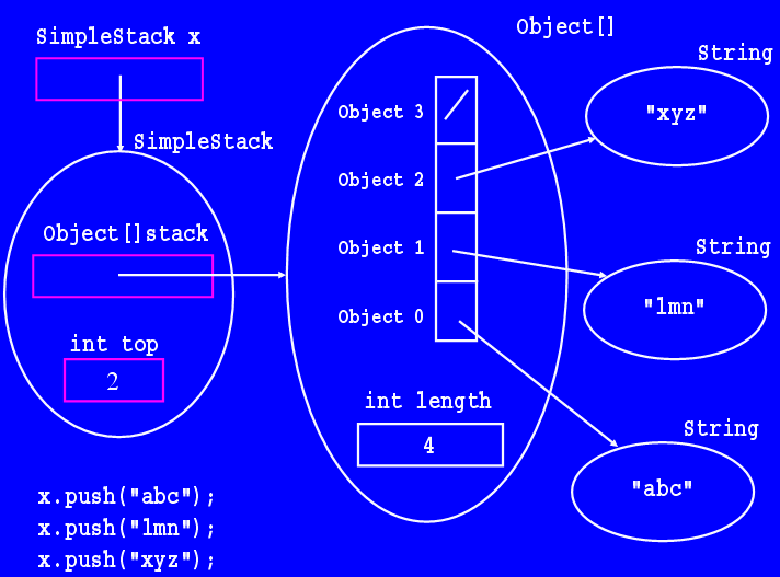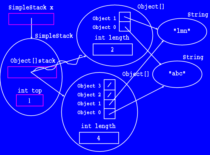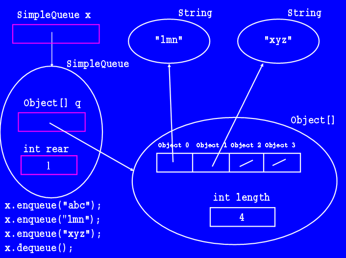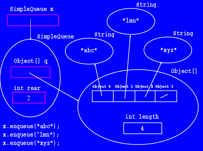 Each SimpleQueue object stores two instance variables: a reference to