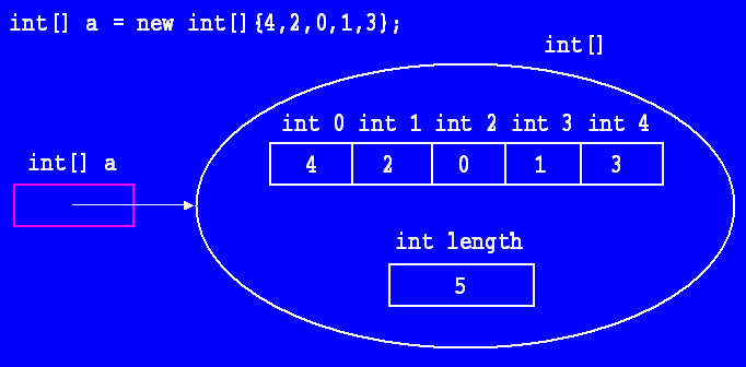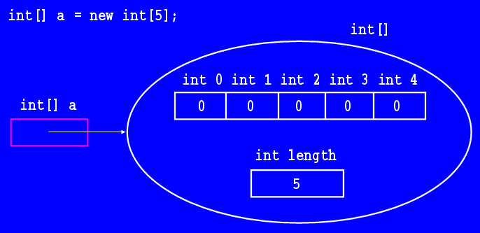 int[] a = new int[5];This variable, and the object it refers to, are illustrated in the following picture.