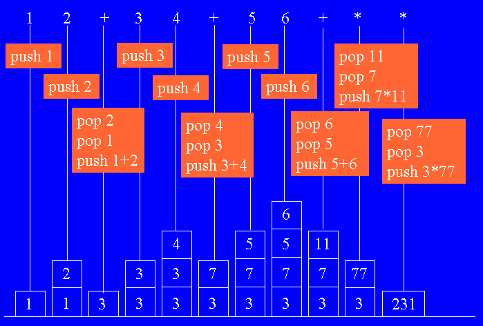 Note that one property of Java and RPN expressions is that the operands appear in the same order; the earlier an operator is applied in the Java expression (using all the complicated rules) the earlier it appears in RPN. Here is a picture illustrating the evaluation process for expressions written in RPN.