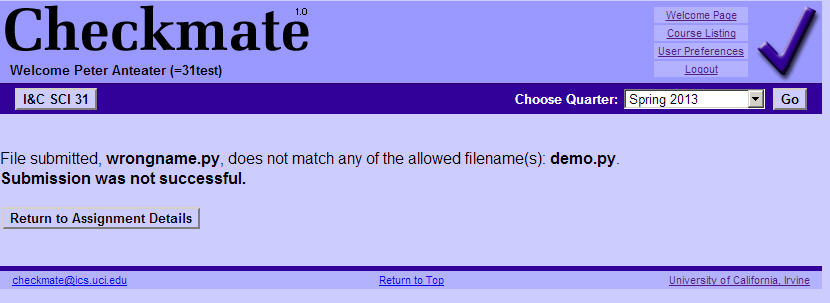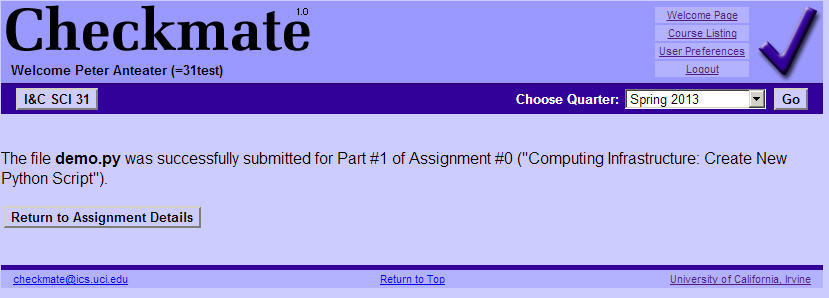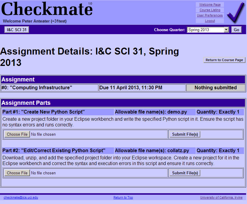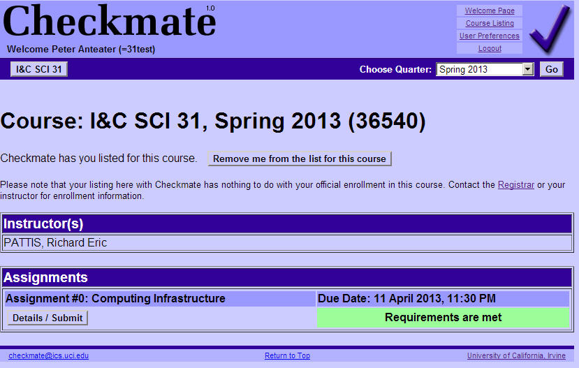 To use Checkmate, you must first activate your UCInetID. If you have not already done so, activate it now. Once you have an activated UCInetID, you need to Login to Checkmate and enroll yourself in my appropriate course (you do this only once, at the start of the quarter). The rest of this handout shows you how. This handout was last updated in Spring 2013, showing a student setting up checkmate for ICS-31. Generally, Checkmate is a stable system that doesn't change much. When you follow these instructions, make sure that you specify the correct quarter and course.You will first see the UCInetID verification page
