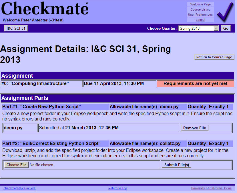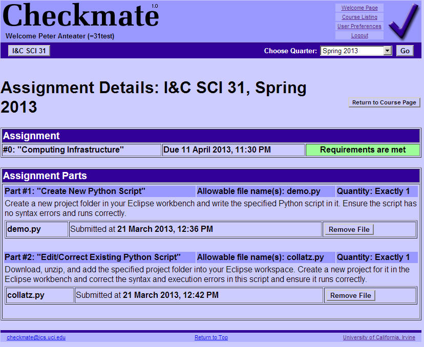 The text Requirements are met in a green background, appears because all parts for this assignment have now been successfully submitted. Of course, this says nothing about the quality or correctness of the submission; it pertains only to the requirement that all needed files, with the correct names, were submitted. Again, by using the Remove File buttons you can remove files that you submitted early, so that your resubmit any/all parts. These files are never really removed from the dropoff system, but instead are put in a special "old submission" area that Checkmate maintains. Finally, if you return to the Course Page, which shows summary information about each assignment, you will see a page similar to the following one.