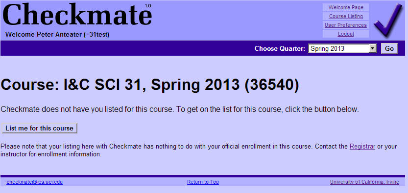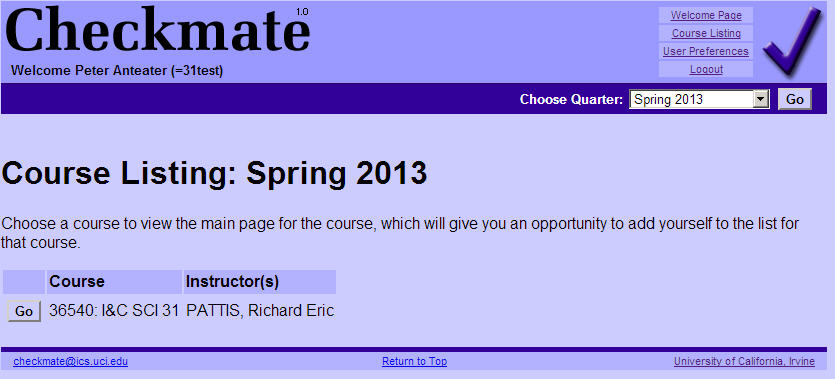 Ensure that Choose Quarter is the correct quarter (change it with the pulldown menu and click the Go button if necessary). Now you should click on the Course Listing link to enroll yourself in ICS-31 (or whatever course you are in). You will next see a page similar to the following one (except that it will likely have more courses and instructors using checkmate this quarter).