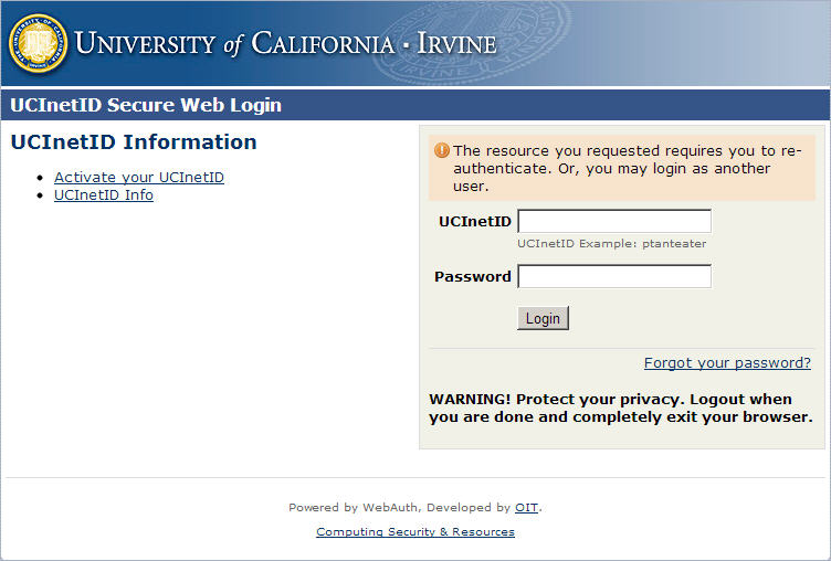 Enter your UCInetID and Password on this page. You will next see the following page, which includes your Name (UCInetID): here it shows my name as Peter Anteater and my UCInetID as (=31Test); I had to create this bogus information because I am not a student at UCI.