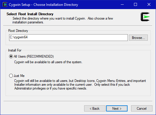 For simplicity and consistency, ensure the Root Directory is C:\cygwin64 (the default); the All Users (RECOMMENDED) radio button should be pushed (the default).