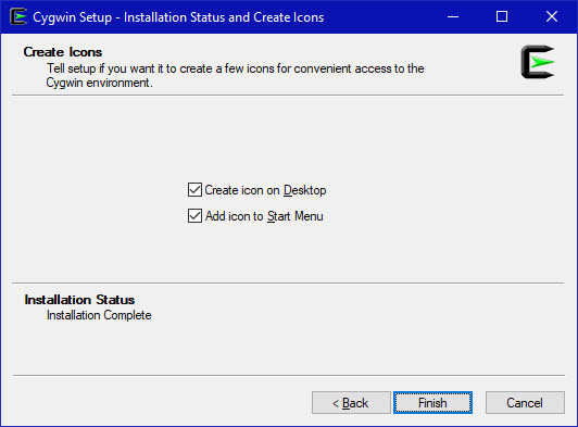 Eventually this window will be replaced by the following Cygwin Setup - Installation Status and Create Icons window on your screen.