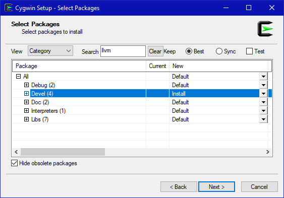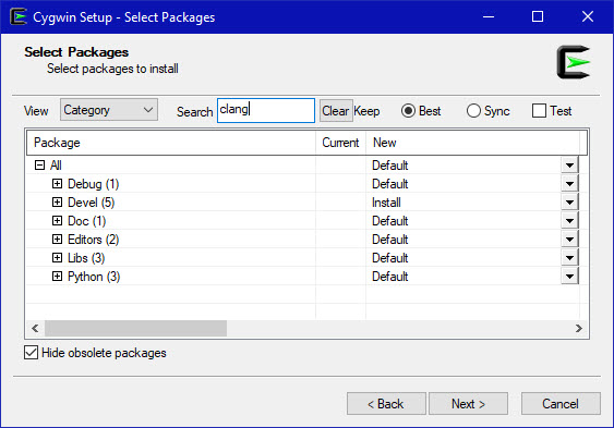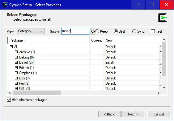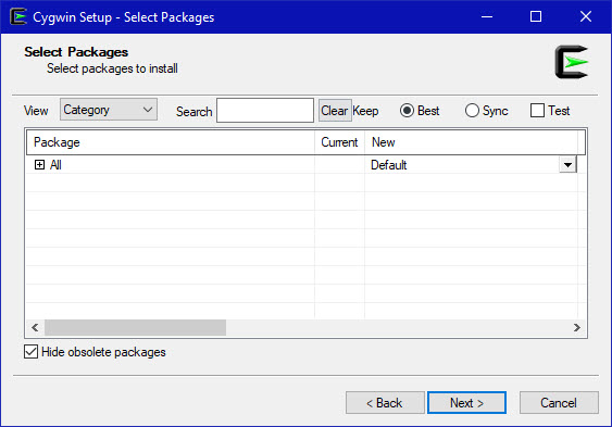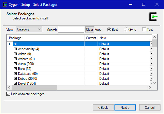 A progress window might temporarily flash on the screen. In the View pull-down list, select Category if it is not already selected. The following Cygwin Setup - Select Packages pop-up window should appear on your screen. (I have midimized this window and enlarged the result horizontally)