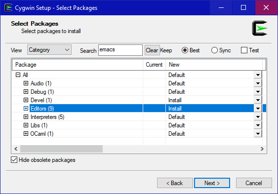 Cygwin automatically installs the vim text editor. If you would like to install the emacs editorType emacs into the textbox; the possible tools related to this name will appear in the window. When they do, to the right of just Devel(5) click the pull-down menu and select Install (although it should already be showing Install, because Devel was selected prior) and do the same with Editors(9).