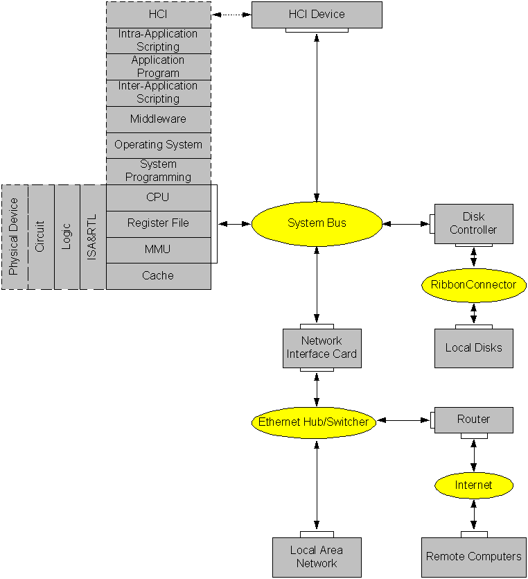 We have components: CPU, Memory, MMU (Memory Management Unit), Disk and Disk Controller, Display Controller and Monitor and NIC (Network Interface Card); system bus is a connector.