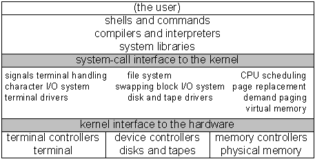 As well-known similar features between UNIX and Linux, UNIX consists of two separable parts: the kernel and the system programs. We can view the UNIX operating system as being layered, as shown in Figure 15.Everything below the system-call interface and above the physical hardware is the kernel. The kernel provides the file system, CPU scheduling, memory management, and other operating system functions through system calls. System programs use the kernel-supported system calls to provide useful functions.